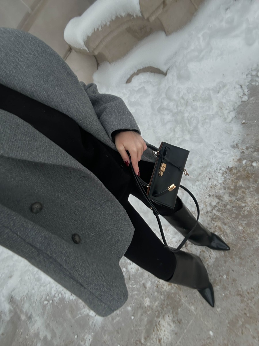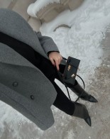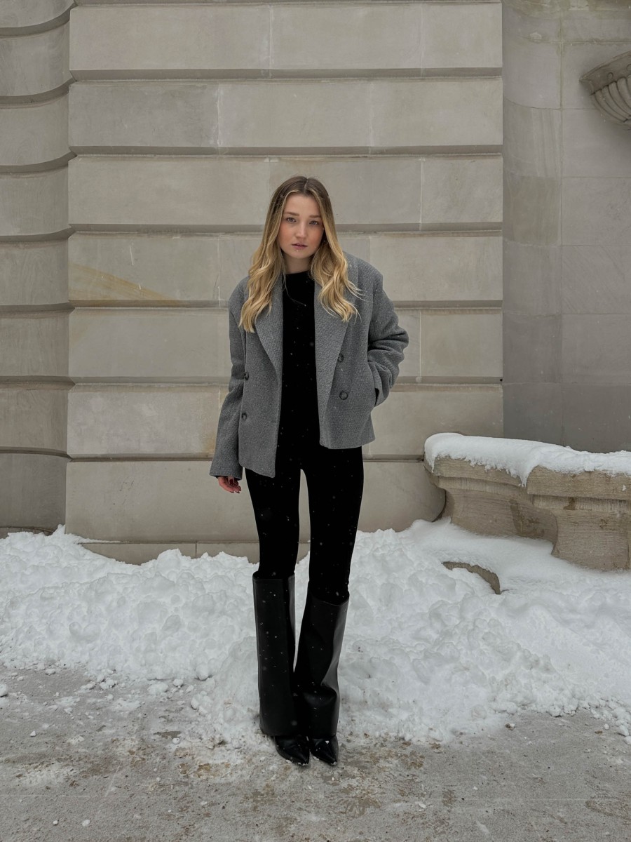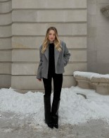 The jacket is made from high-quality virgin wool with a touch of cashmere. The fabric comes from Italy. The material has an elegant texture. The jacket features a stylish wide collar, making it perfect for cooler days. It fastens with buttons and has internal pockets. Finished with a viscose lining.