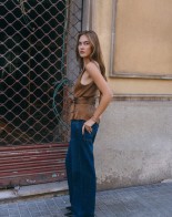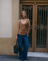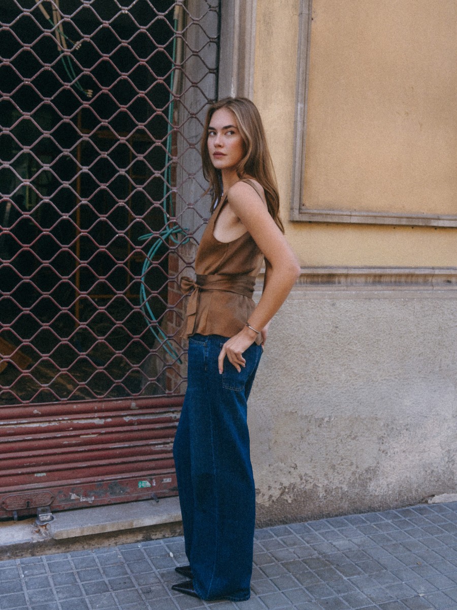 An elegant bias-cut top that impresses with its unique design and timeless style. The scarf detail adds sophistication and a distinctive character to any outfit. Made from a soft-touch fabric in beautiful brown tones, it is a versatile addition to your wardrobe. The top looks stunning both tucked into trousers or worn loose. It pairs perfectly with elegant trousers or classic jeans, allowing you to create a variety of looks. The striking neckline at the front and back adds subtle allure and femininity, highlighting your uniqueness. This is a timeless piece that will stay with you for years to come – perfect for any season and occasion.